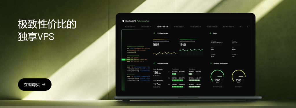 测试使用的主机为ClawCloud 中国优化-香港 VPS,具体配置如下: