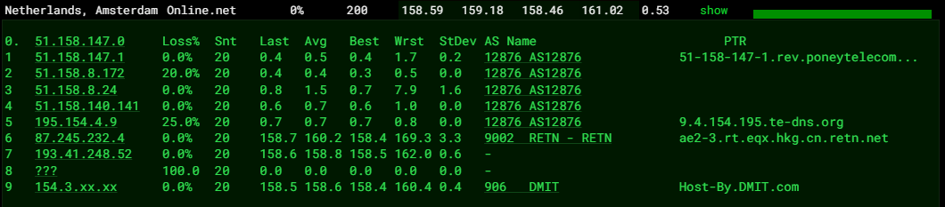 可以看出,对于荷兰方向的访问,对方直接接入了RETN并传送数据到香港,随后进入目标主机。这说明对于这一地区该ISP的访问,数据成功地通过了RETN优化线路。