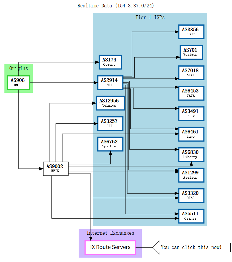可以看到,DMIT接入了Cogent和NTT两家Tier 1 ISP,由NTT负责与其他Tier 1 ISP的通信,并接入了Tier 2 ISP RETN(一个亚-欧国际通信精品线路)用于优化对欧洲的连接。